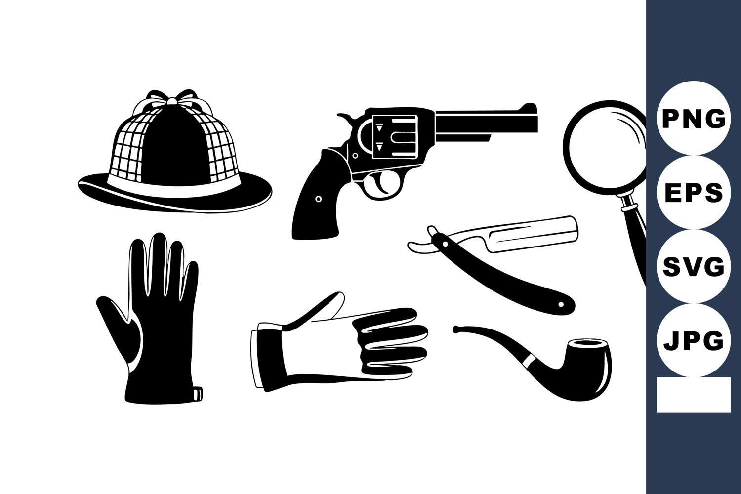 Detective hat revolver magnifying glass gloves straight razo example image 1