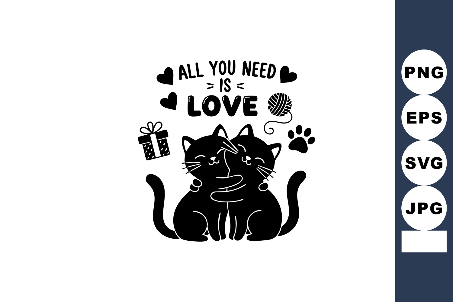 Vector shows two hugging cats with hearts, paw prints, gift, and yarn ball above text All you need is love. Simple, charming, affectionate, and playful mood.