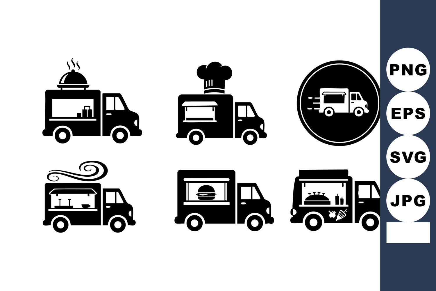 This vector set features various food truck icons including steaming food, chef hat, burger, and fast delivery truck symbol, representing mobile food services with a clean, modern style. Friendly and dynamic.