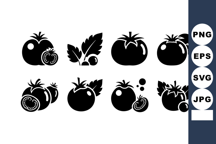 This vector set features black silhouette tomato fruits and leaves, including whole and sliced designs, showcasing natural plant elements in a clean minimalist style. Simple and versatile.
