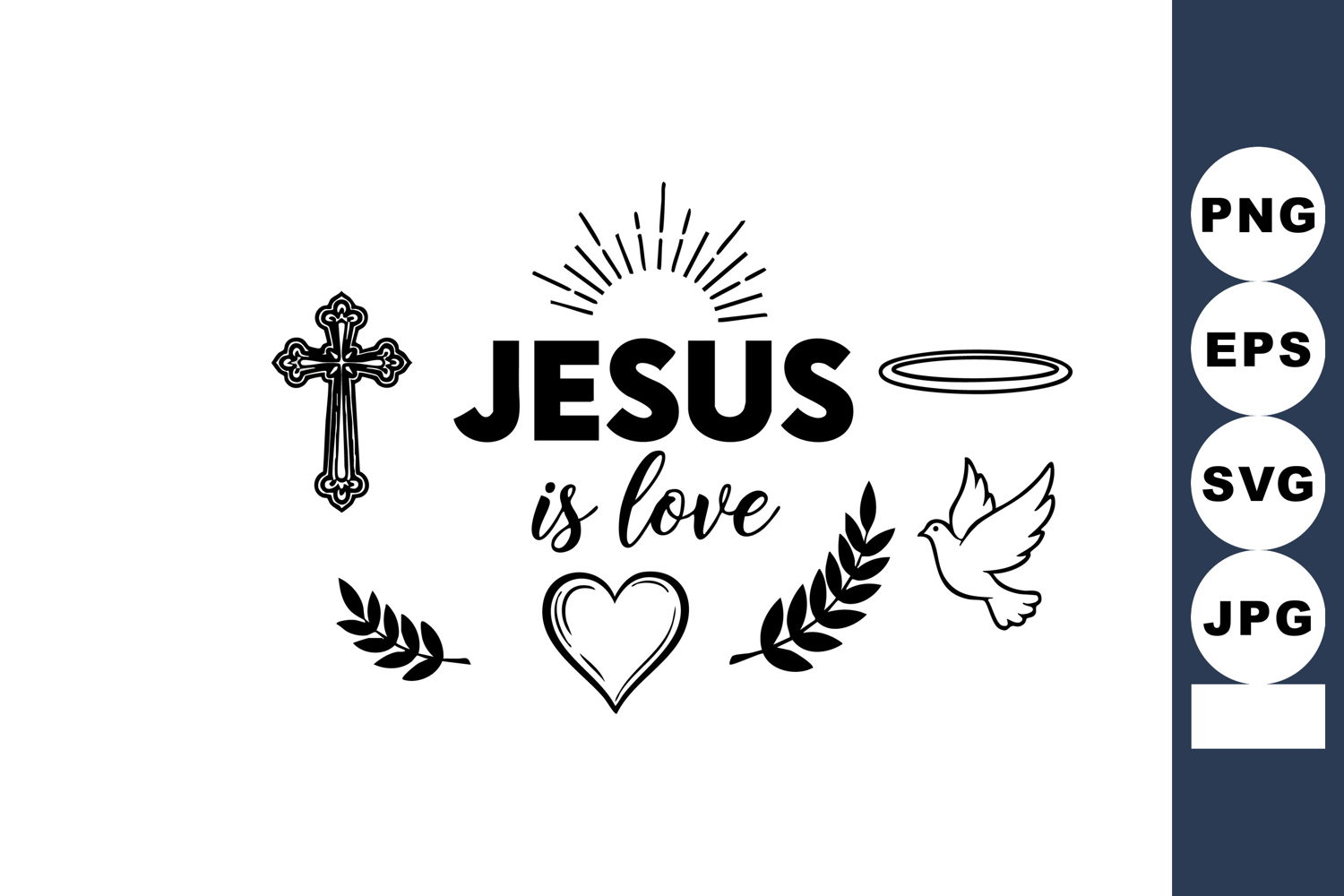 This vector design features Jesus is love text with cross, heart, dove, halo, and leaves representing faith and spirituality in a simple black silhouette style, peaceful mood.