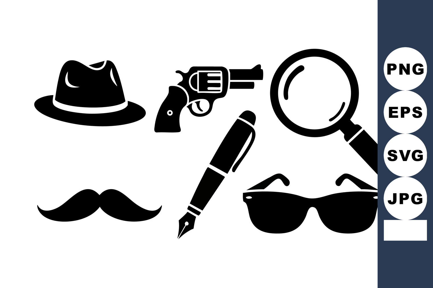 This vector file shows a black silhouette collection of detective accessories including a hat, revolver, magnifying glass, pen, mustache, and sunglasses in a clean design style. Sleek mood.
