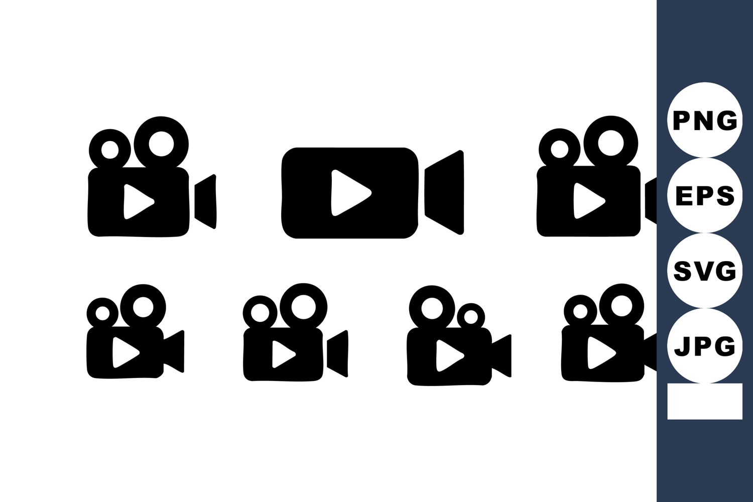 This vector features a collection of black video camera icons in various styles and shapes, suitable for multimedia, recording, and video production themes. Clean and minimalist design, simple mood.