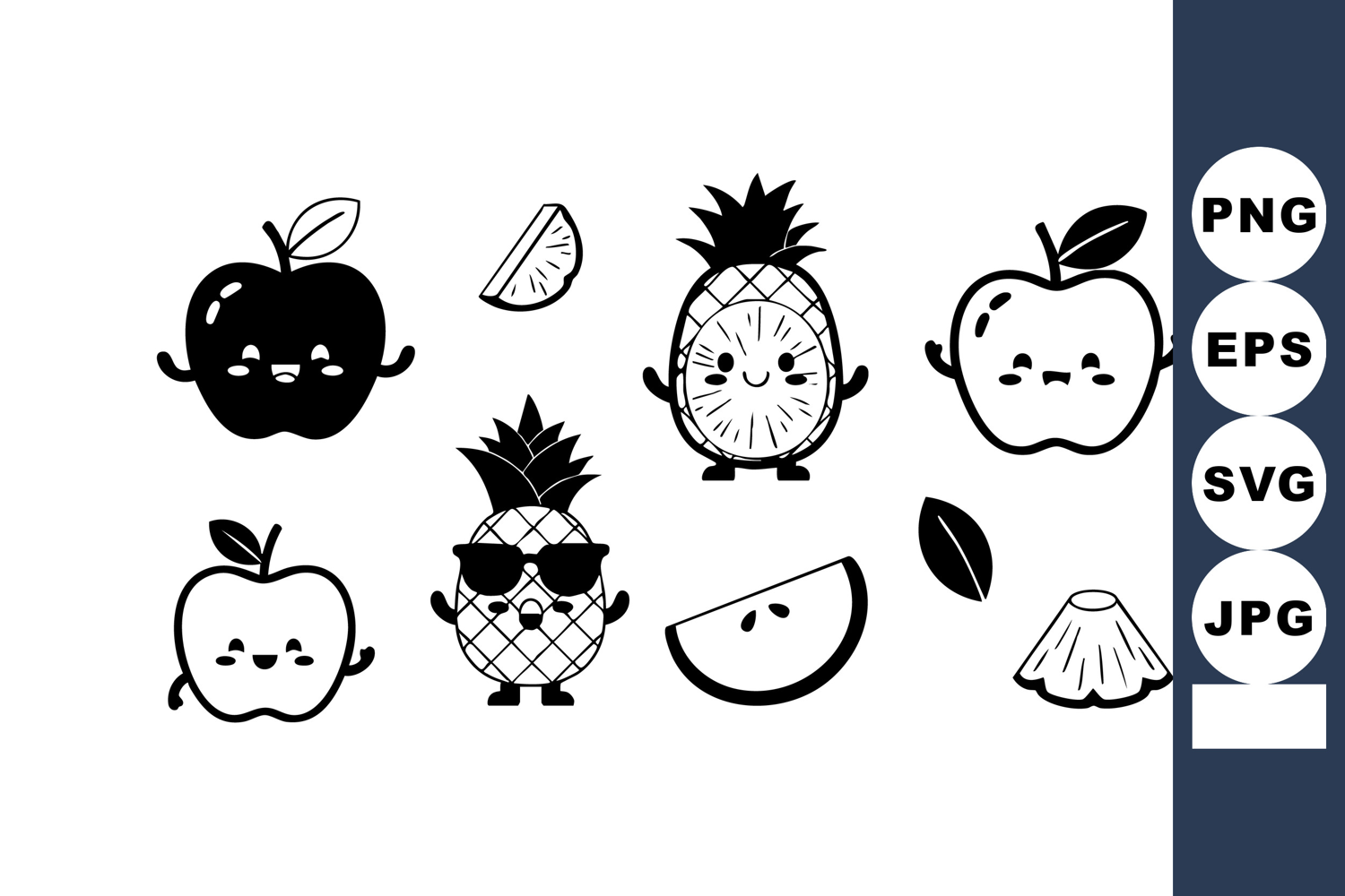 This vector illustration shows adorable kawaii apple and pineapple characters with smiling faces, leaves, and fruit slices in black and white style. Fun and playful mood.