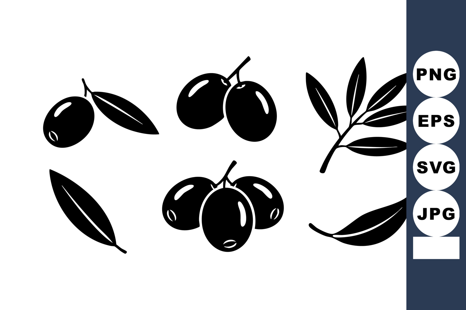This vector set shows black olive fruits and leaves in simple style for natural and organic food design projects. The design is clean and minimal, creating a fresh mood.