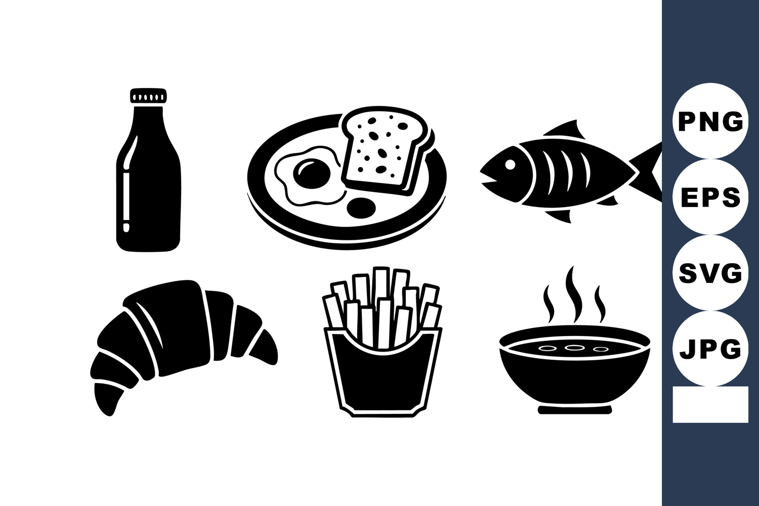 Set of black and white meal icons including croissant, fries, fish, soup, toast, and bottle. Simplified vector style with kitchen and food theme. Clean and minimal mood.