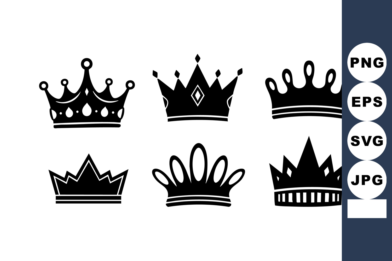This image shows six unique black crown silhouettes in vector format, perfect for regal and royal themed designs. The style is simple and bold, creating a majestic mood.