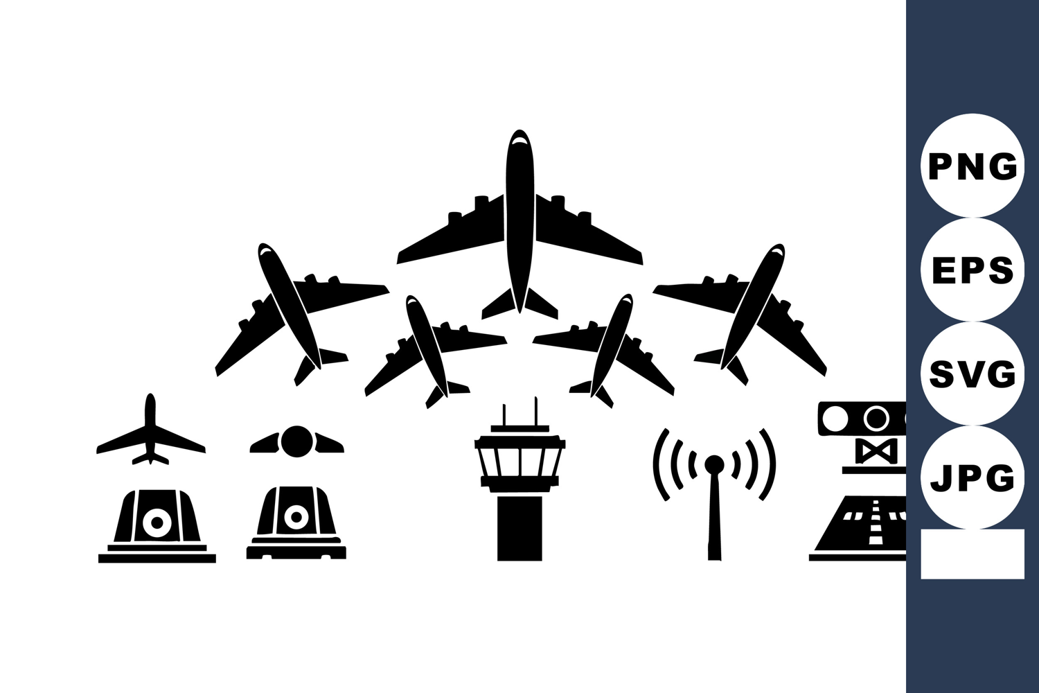 This vector shows airplane silhouettes in flight with control tower, radio signal, and runway lights icons in black. It conveys aviation, communication, and airport themes clearly. Modern style.