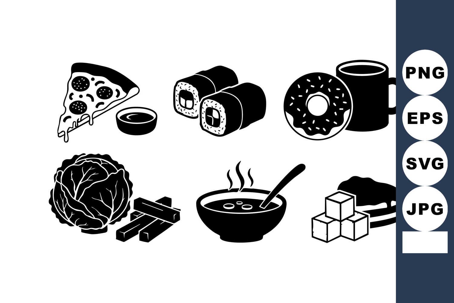 This vector shows diverse food and drink items such as pizza, sushi, donut, coffee, cabbage, cinnamon, soup, cake, and sugar cubes in black and white style. Simple and clear mood.