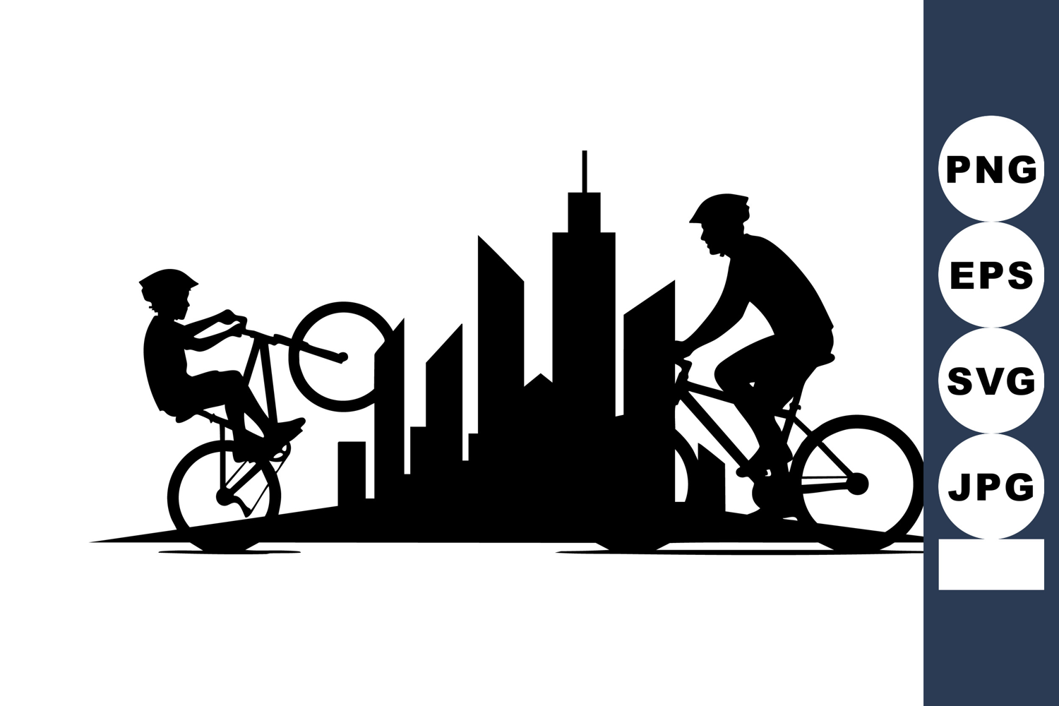 Two bicyclists ride and perform tricks near a city skyline silhouette in black and white vector style. The urban scene shows dynamic movement and active lifestyle. Energetic mood.