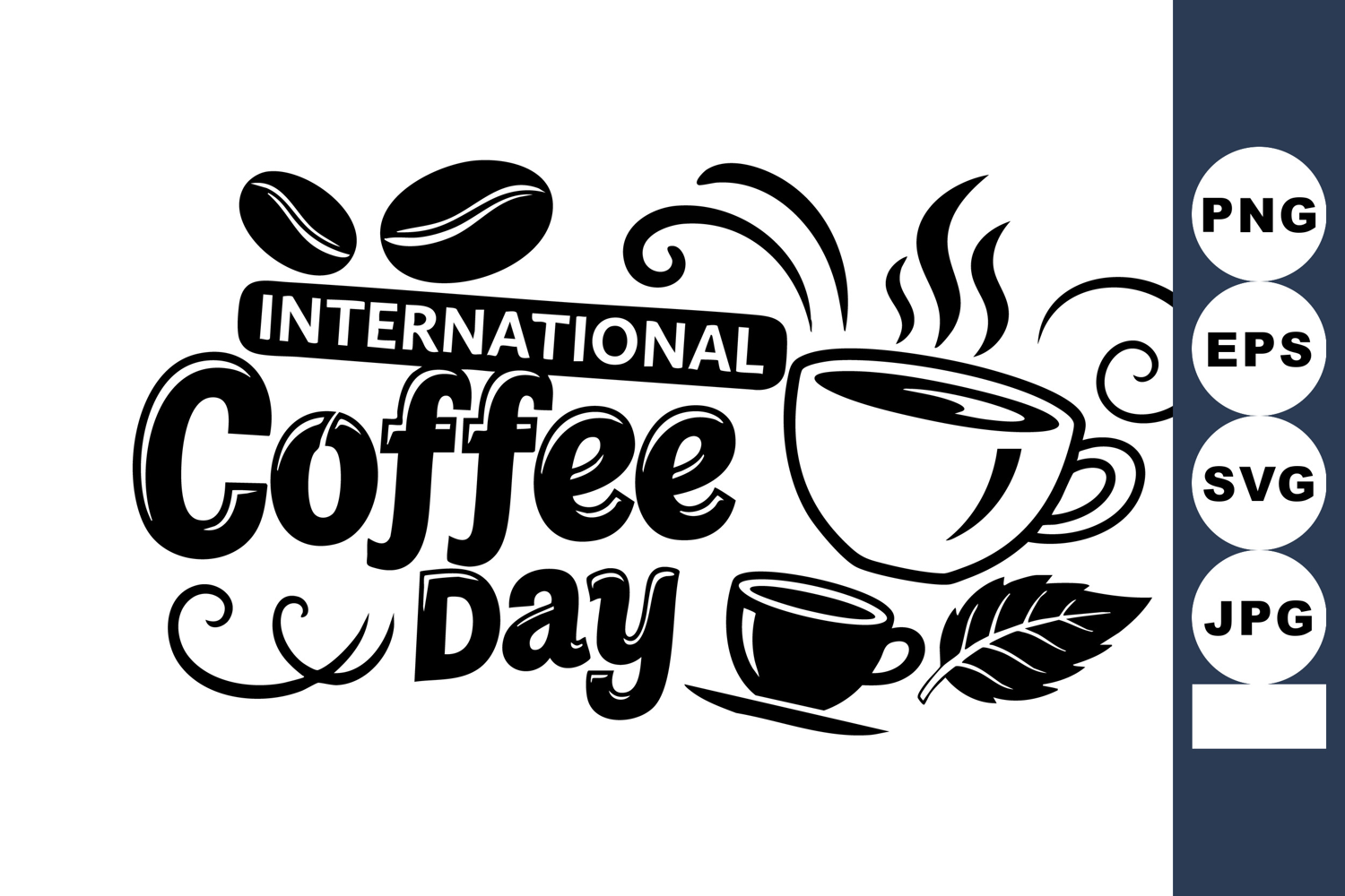 This vector features a black and white International Coffee Day design with steaming coffee cup, coffee beans, and decorative swirls in a clean style. Festive and simple mood.