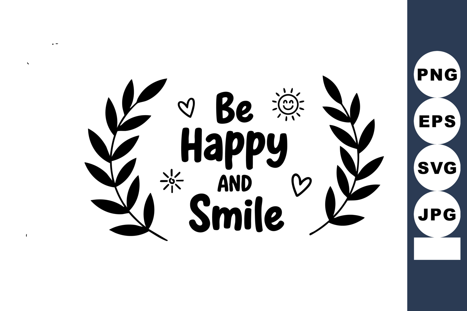 This vector design features the inspirational phrase Be Happy and Smile surrounded by laurel leaves, hearts, and sun symbols, conveying positivity and joy in a simple black style. Cheerful mood.