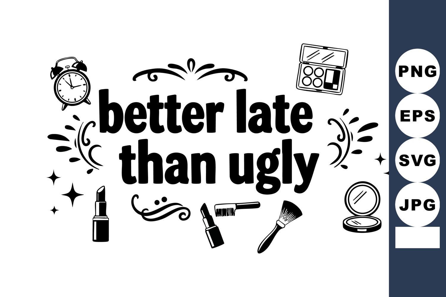 Better Late Than Ugly quote with makeup icons and decorative