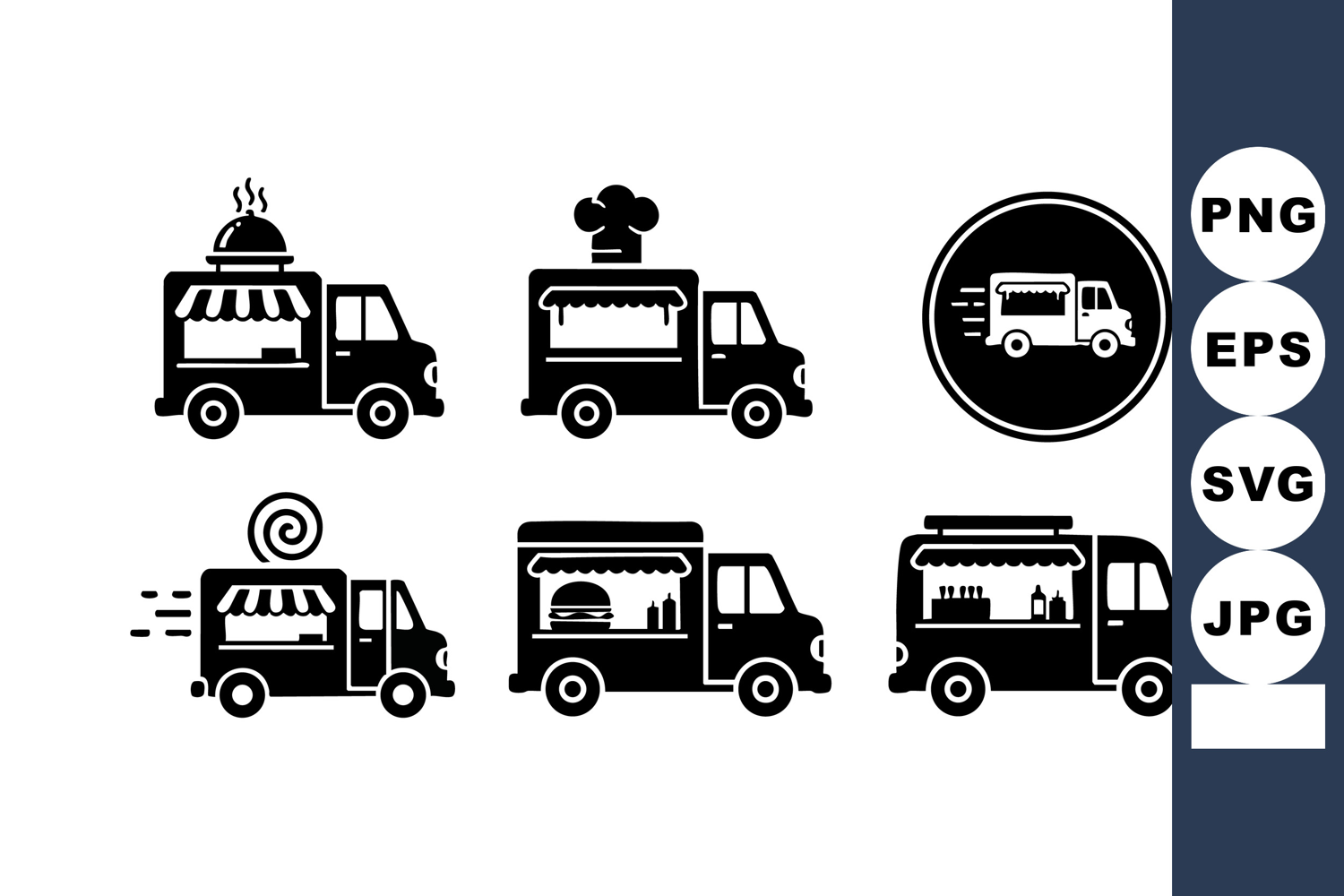 This vector set displays various food truck icons including delivery and fast service symbols, representing mobile food business and quick meals with clear black silhouette style. Modern and practical.