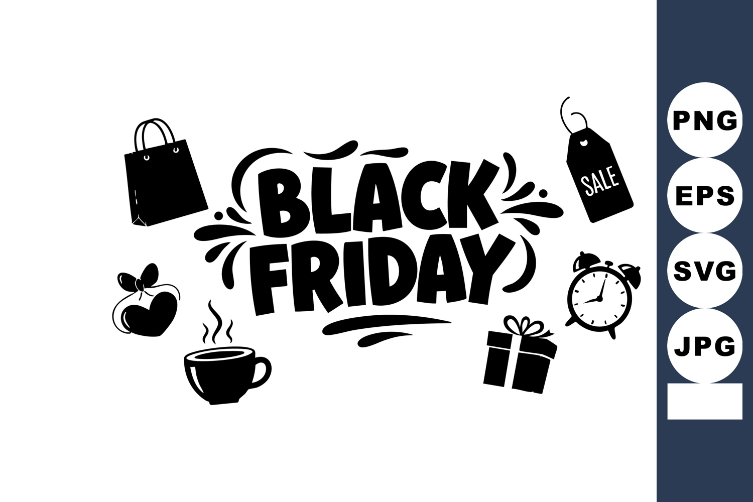 Vector design features Black Friday text surrounded by shopping icons including gift bag, alarm clock, coffee cup, apple, and sale tag, conveying excitement and urgency. Energetic mood.