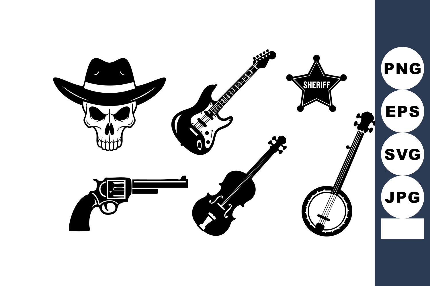 The vector features a cowboy skull wearing a hat, a sheriff badge, a revolver, an electric guitar, a violin, and a banjo, all in black and white silhouette style, evoking western themes and music. Bold and iconic.