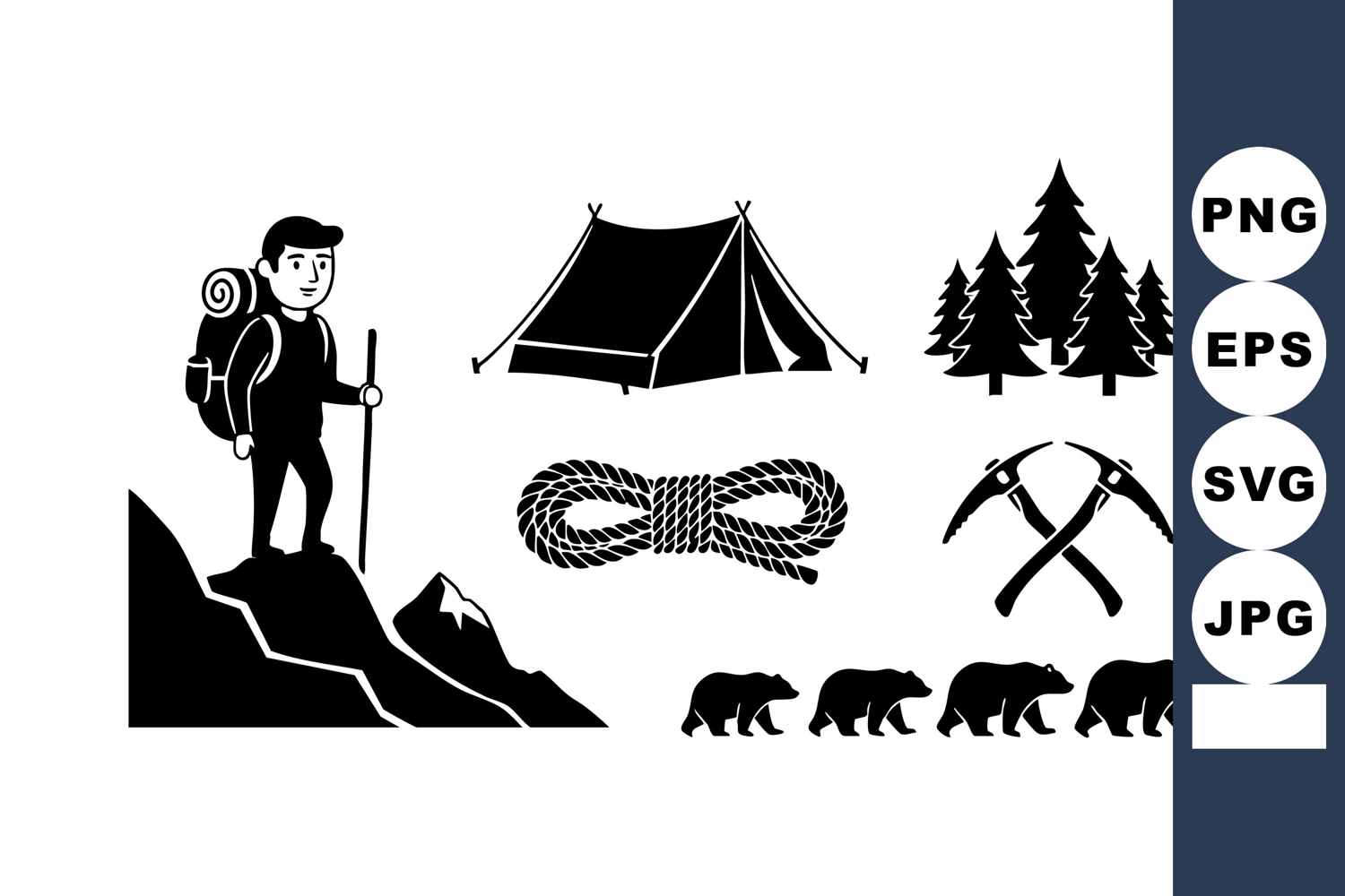 This vector shows essential outdoor hiking gear including a tent, forest trees, rope, ice axes, and bear silhouettes. It captures mountain trekking elements with a black and white style, adventurous mood.