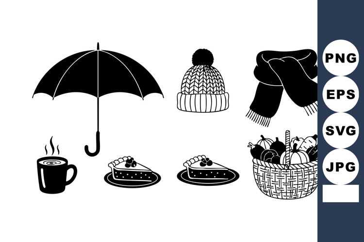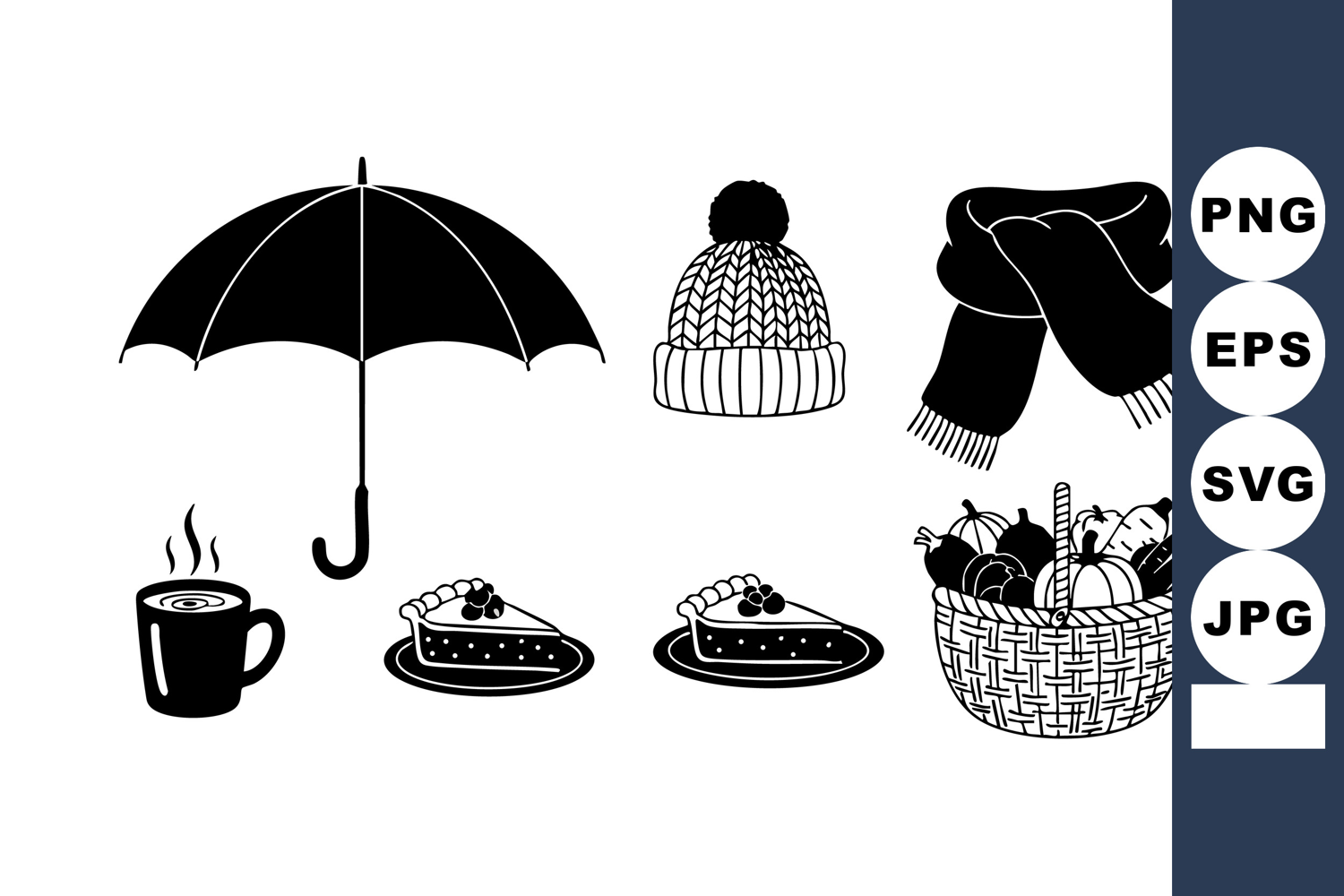 This vector set features winter essentials including an umbrella, hot drink, pie slices, knit hat, scarf, and a basket of produce, conveying seasonal coziness and warmth. Cheerful mood.