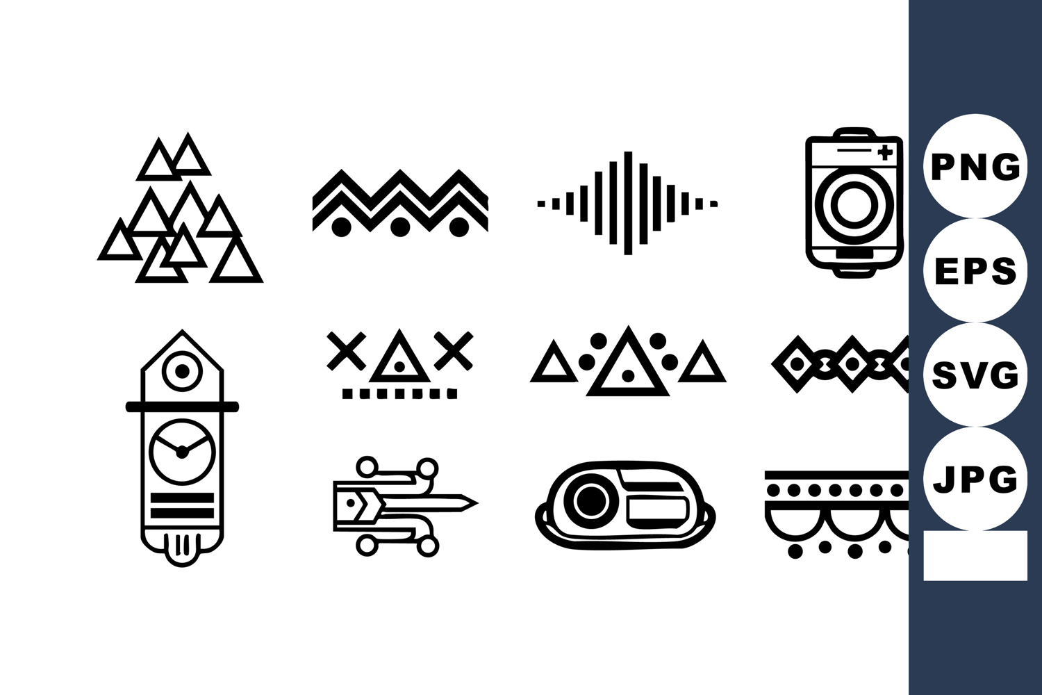 This vector set features abstract black geometric shapes including triangles, zigzags, lines, and a modern speaker icon in a clean minimalist style, perfect for design projects. Contemporary mood.