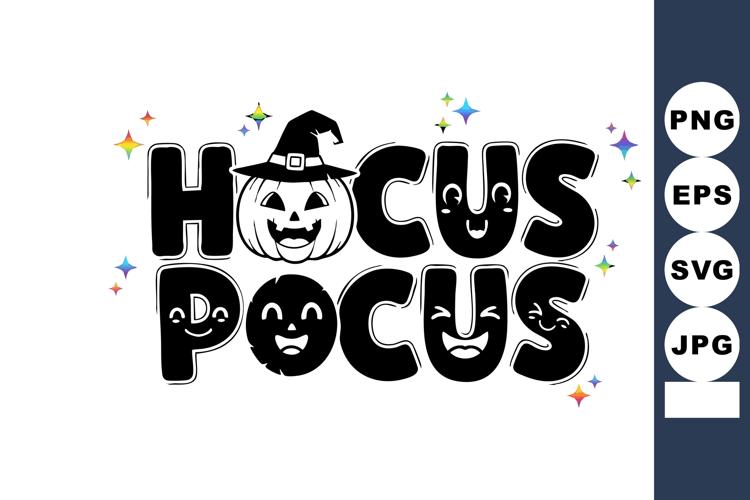 Vector text design featuring Hocus Pocus with a pumpkin wearing a witch hat and smiling faces surrounded by colorful stars, creating a festive Halloween atmosphere. Playful and spooky mood.
