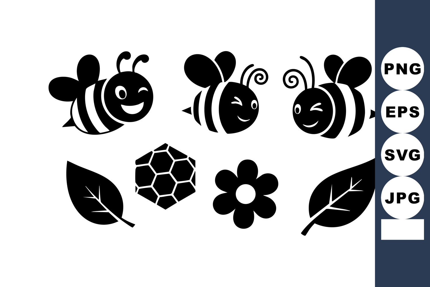 Vector illustration features three cheerful bees flying near a flower, honeycomb, and two leaves in simple black and white design, creating a playful and nature-inspired mood.