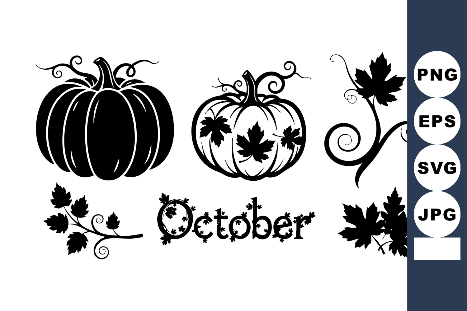 This vector set features pumpkins, autumn leaves, and decorative swirls in black silhouette style, representing October and fall season themes. Ideal for seasonal design projects with a cozy mood.