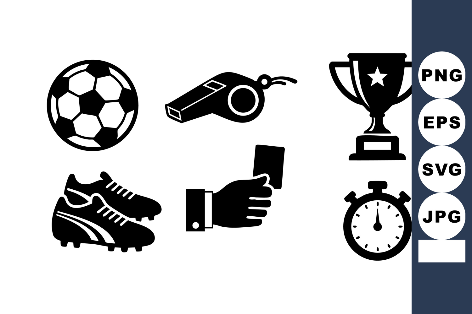 Vector illustration of soccer referee icons including ball, whistle, trophy, shoes, card, and stopwatch, representing essential elements in sports officiating and game management. Energetic.