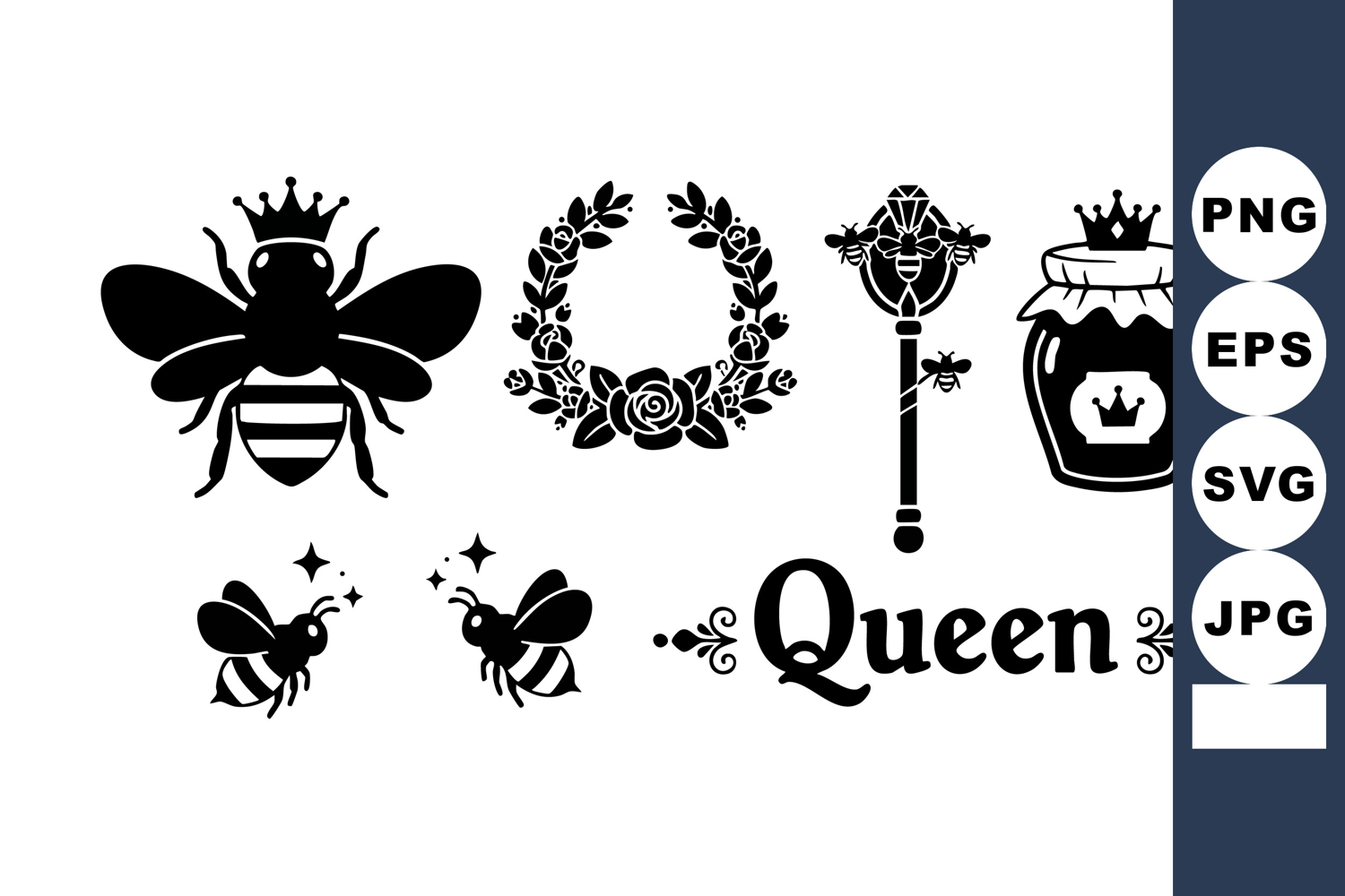 This vector set features queen bee icons with crowns, a floral wreath, honey jar, and a magical scepter in vintage style, conveying royalty and nature themes in black silhouette. Elegant.