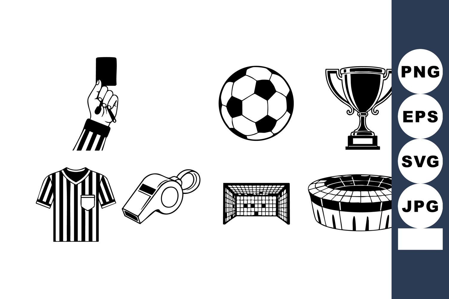 Vector illustration shows soccer icons including referee with card, whistle, trophy, ball, jersey, stadium, and goal representing the sports essential elements in black and white style, energetic.