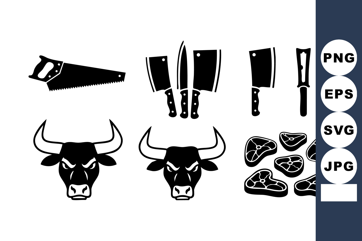 Butcher tools with bull heads and meat cuts vector collectio example image 1