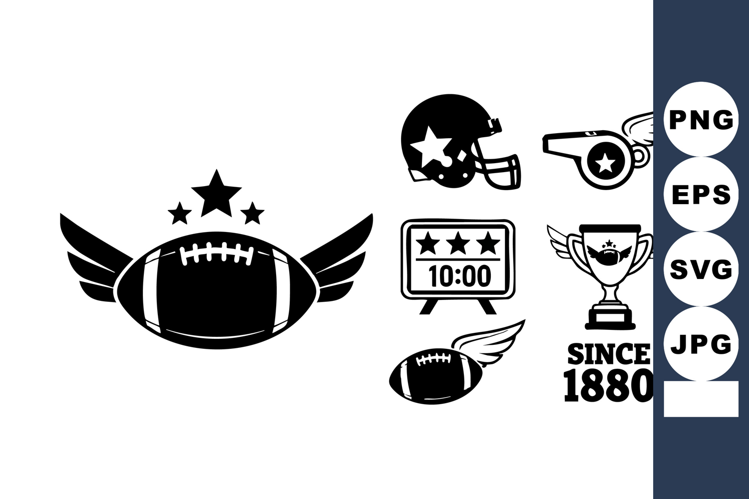 This vector set shows classic American football elements including a winged ball, helmet, scoreboard, and trophy with vintage style referencing 1880. The design feels nostalgic and sporty.