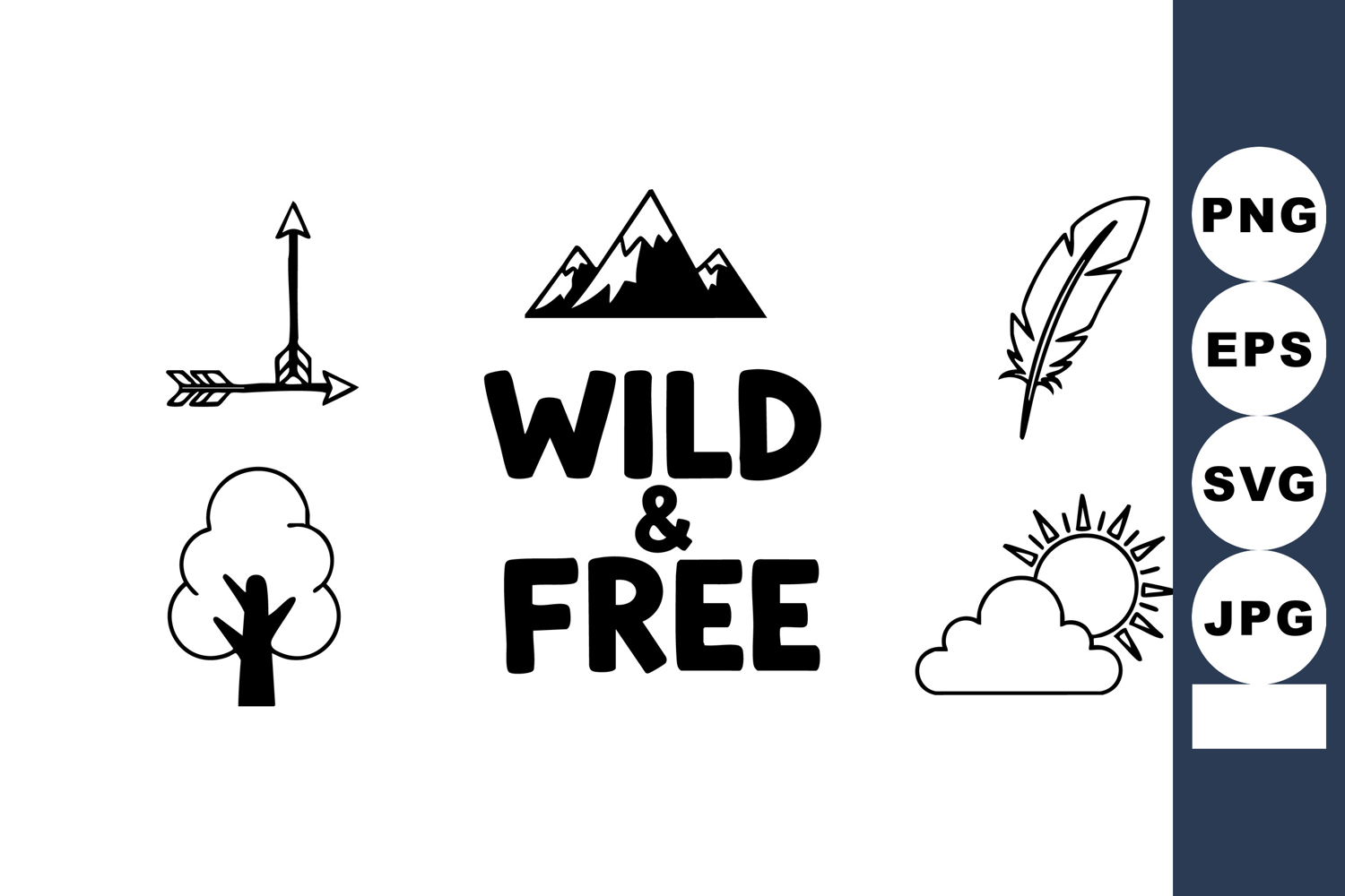 This vector file displays wild and free text surrounded by simple nature icons including an arrow, tree, feather, sun, cloud, and mountain, creating a rustic and adventurous mood.