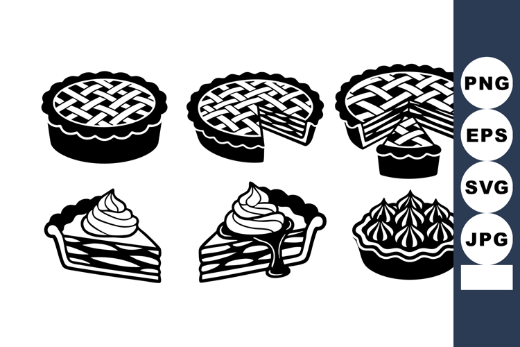 This vector set shows classic pie silhouettes with lattice tops and whipped cream toppings in bold black style, ideal for baking and dessert design projects. Crisp and elegant.