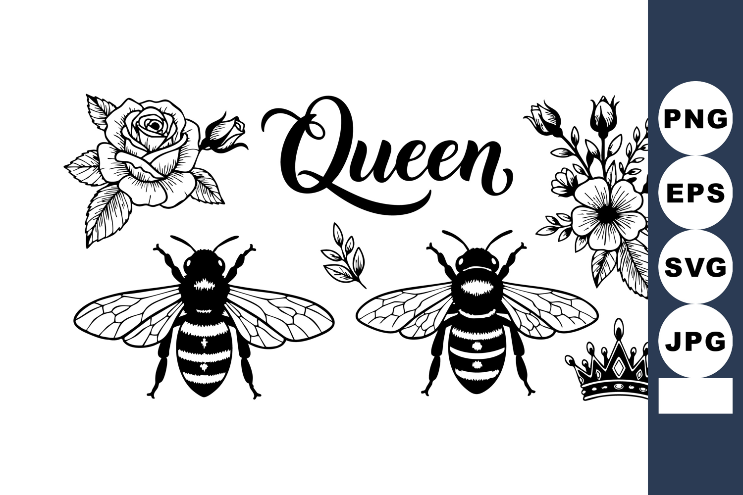 This vector features two detailed bees, a rose, a floral bouquet, and a crown surrounding the word Queen, showcasing nature and royalty elements in a black and white style, elegant mood.