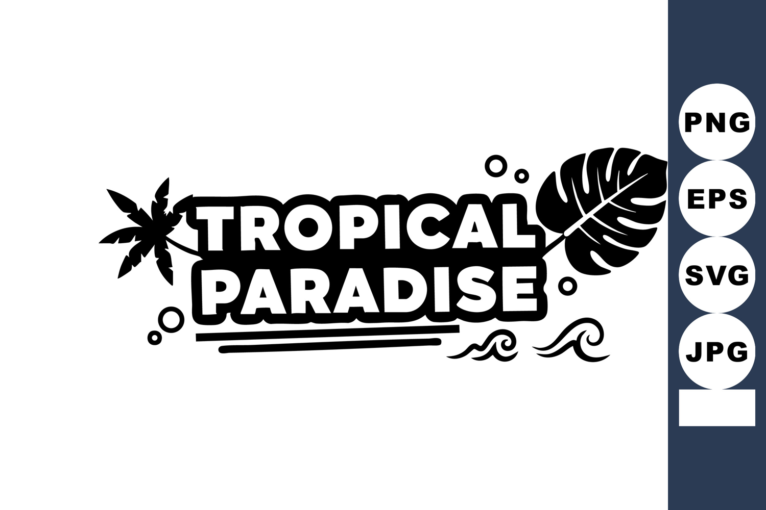 Black and white tropical paradise lettering surrounded by tropical leaves and ocean wave icons in a clean vector style, conveying a relaxed and joyful summer vibe.
