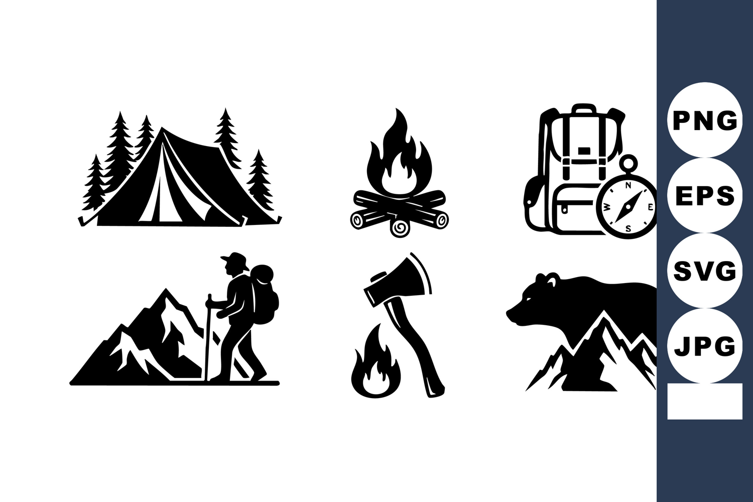Black silhouette icons of camping and hiking gear with nature elements including tent, campfire, backpack, axe, bear, and mountains shown in clean vector style. Outdoorsy and bold.
