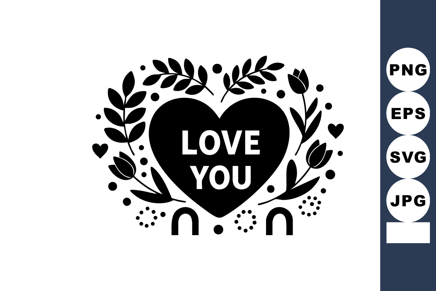 Black heart with love you text surrounded by leaves, tulips, and small decorative elements in vector style. Simple, elegant, and romantic mood.