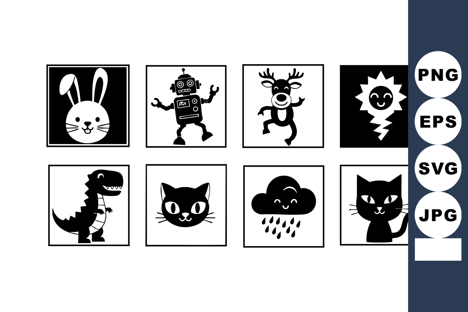 This vector set features black and white icons including a bunny, robot, reindeer, sun, dinosaur, cat, cloud, and black cat in silhouette style, offering playful and minimalist design. Cheerful.