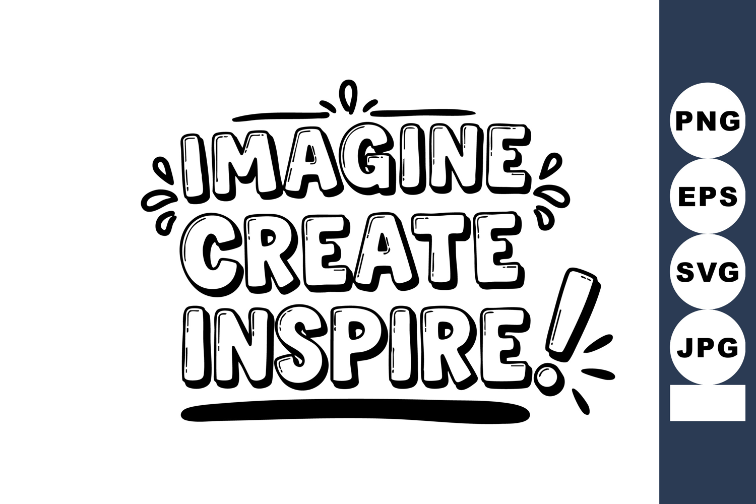This vector features the motivational phrase Imagine Create Inspire with bold hand-drawn lettering and decorative accents, encouraging creativity and positive energy. Uplifting mood.