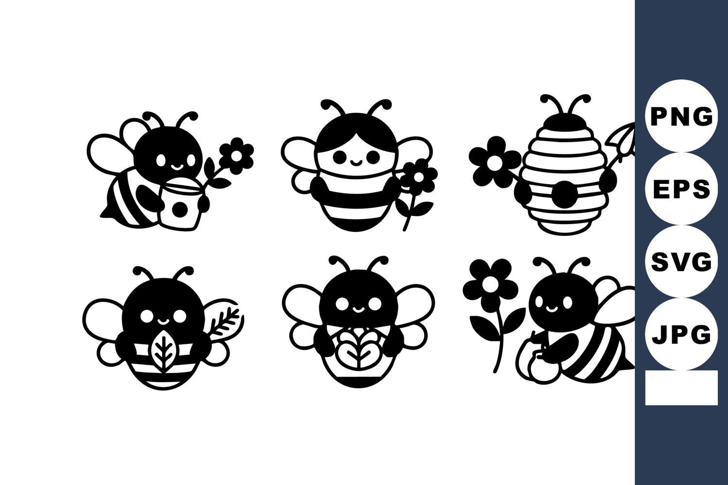 This vector features six adorable cartoon bees with happy expressions holding flowers and leaves in black and white style, conveying cheerfulness and charm. Playful and joyful mood.