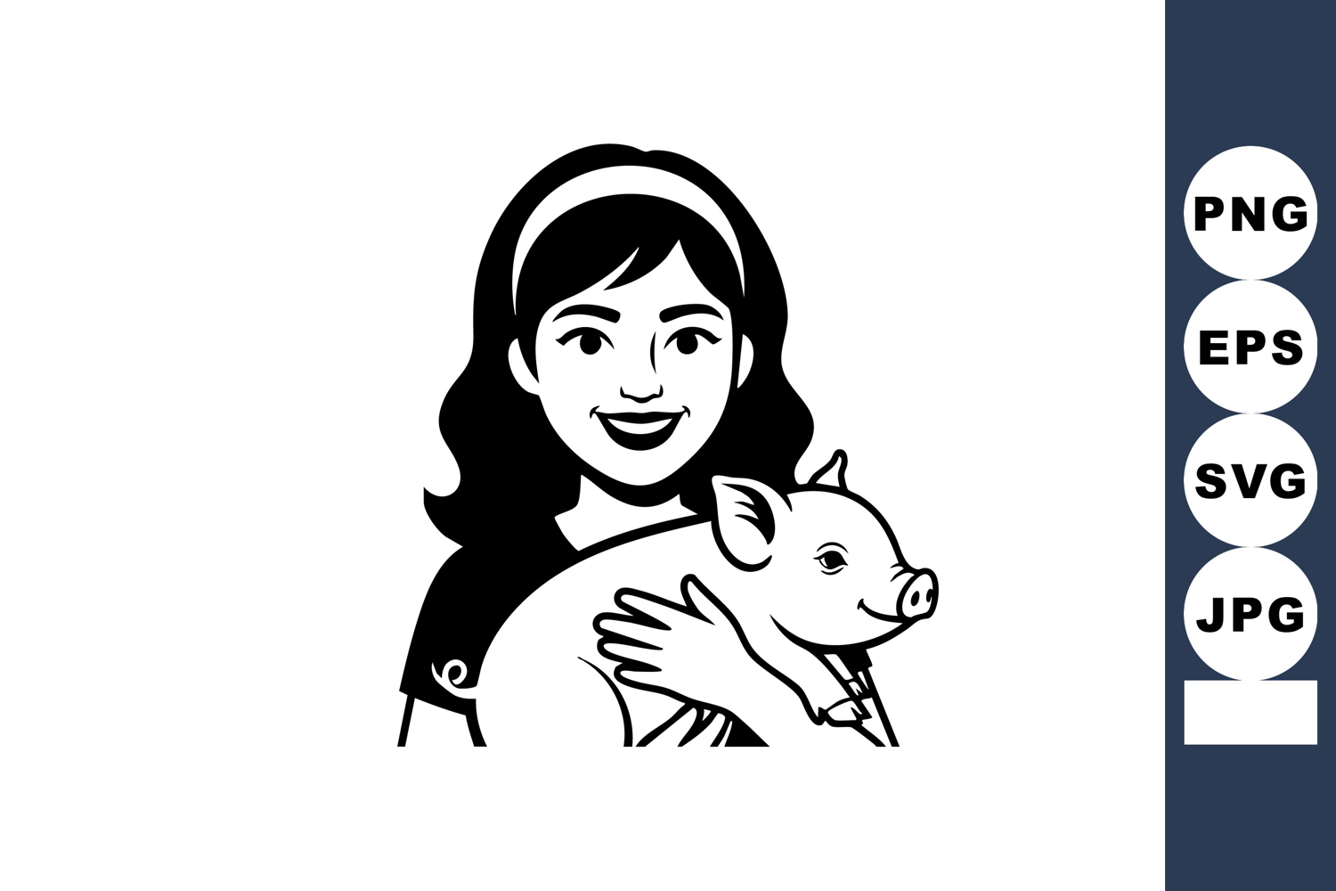 This vector illustration shows a girl smiling while holding a pig in her arms. The image is simple black and white with clear lines, conveying warmth and joy. Cheerful mood.