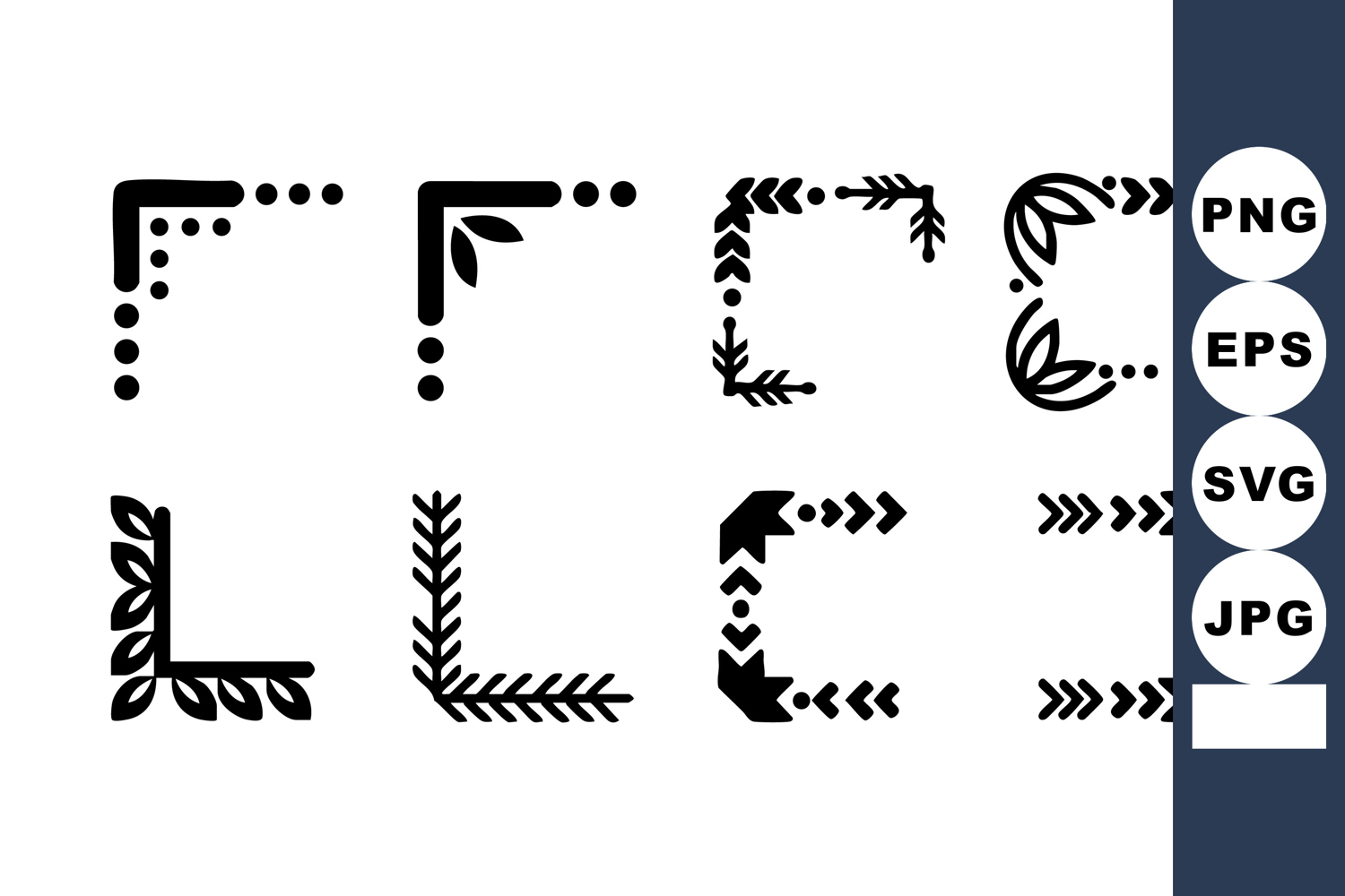 Set of eight black decorative corner elements featuring various ornate patterns in vector style, ideal for elegant borders and frames in graphic design projects. Stylish and artistic mood.