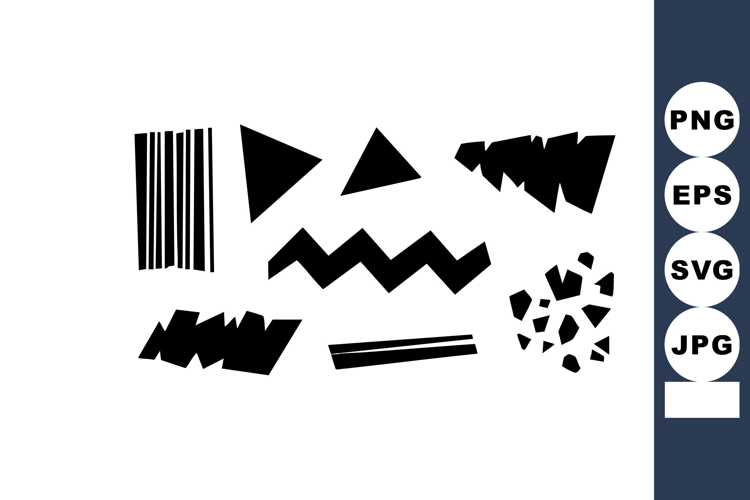 Vector features abstract black geometric shapes including zigzags, triangles, lines, and scattered dots creating a dynamic composition with modern artistic style and visual contrast. Energetic mood.