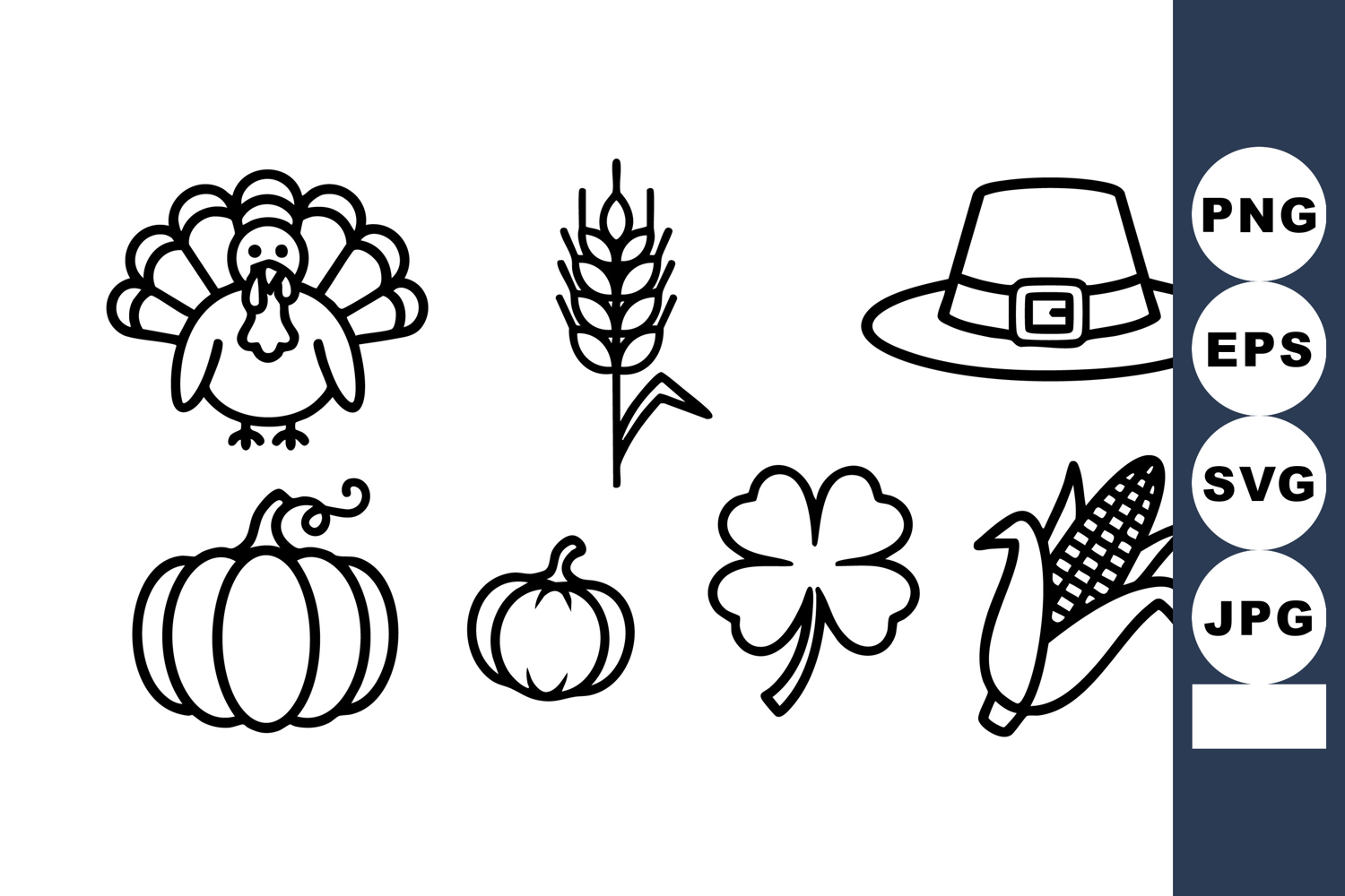 This vector set features black outline icons of a turkey, pumpkins, corn, pilgrim hat, clover, and wheat representing Thanksgiving and autumn harvest themes in a clean line style. Cheerful.