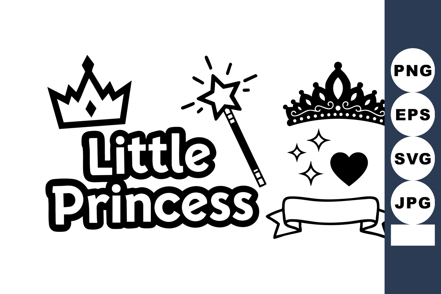 This vector set features a little princess theme with crowns, a magic wand, heart, and blank banner in simple black line art, perfect for kids’ party decoration or design. Charming.
