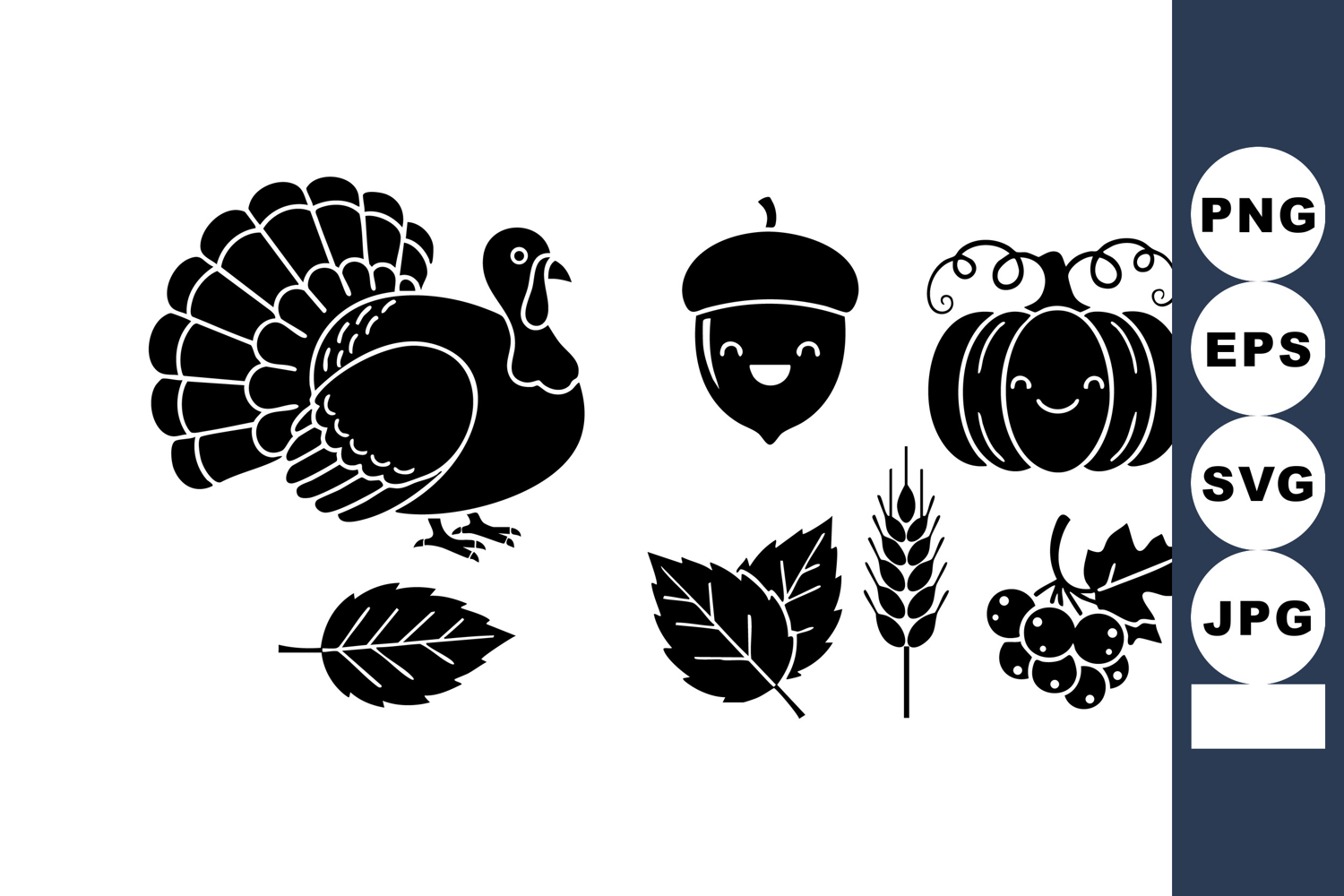 Black silhouette vector features a turkey, acorn, pumpkin, wheat, and autumn leaves representing fall harvest season with rustic charm and festive mood.