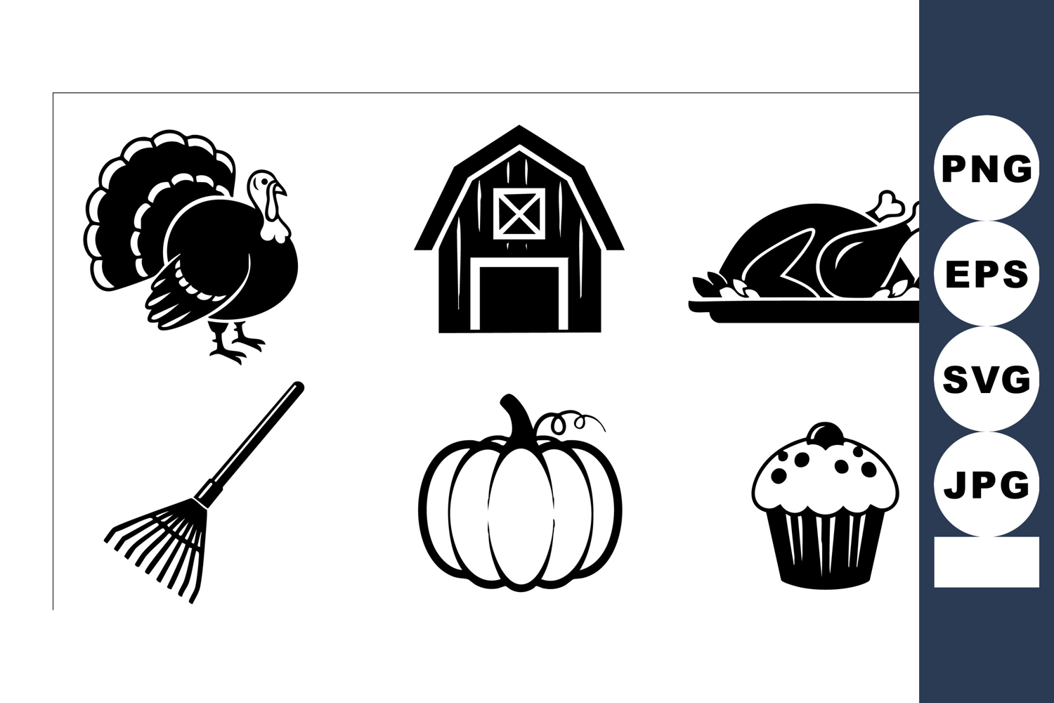Vector icons show a turkey, barn, roasted chicken, rake, pumpkin, and cupcake in black silhouette style, representing farm and Thanksgiving themes. Simple and clear design, festive mood.