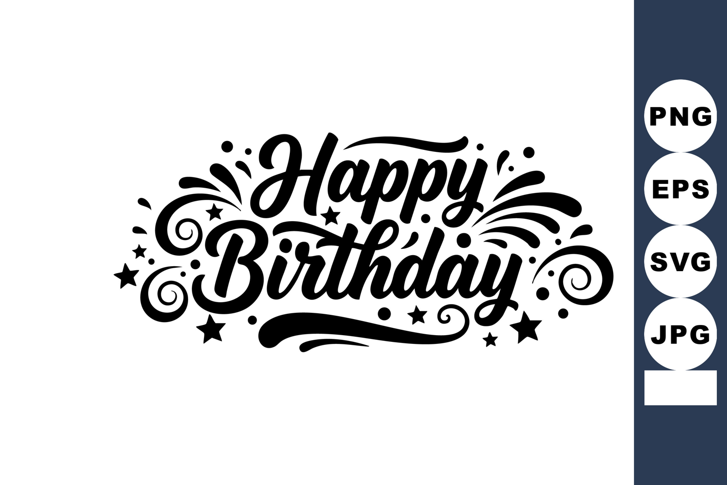 This vector features Happy Birthday in elegant calligraphy surrounded by decorative swirls and stars, perfect for festive celebration designs. The style is joyful and festive.