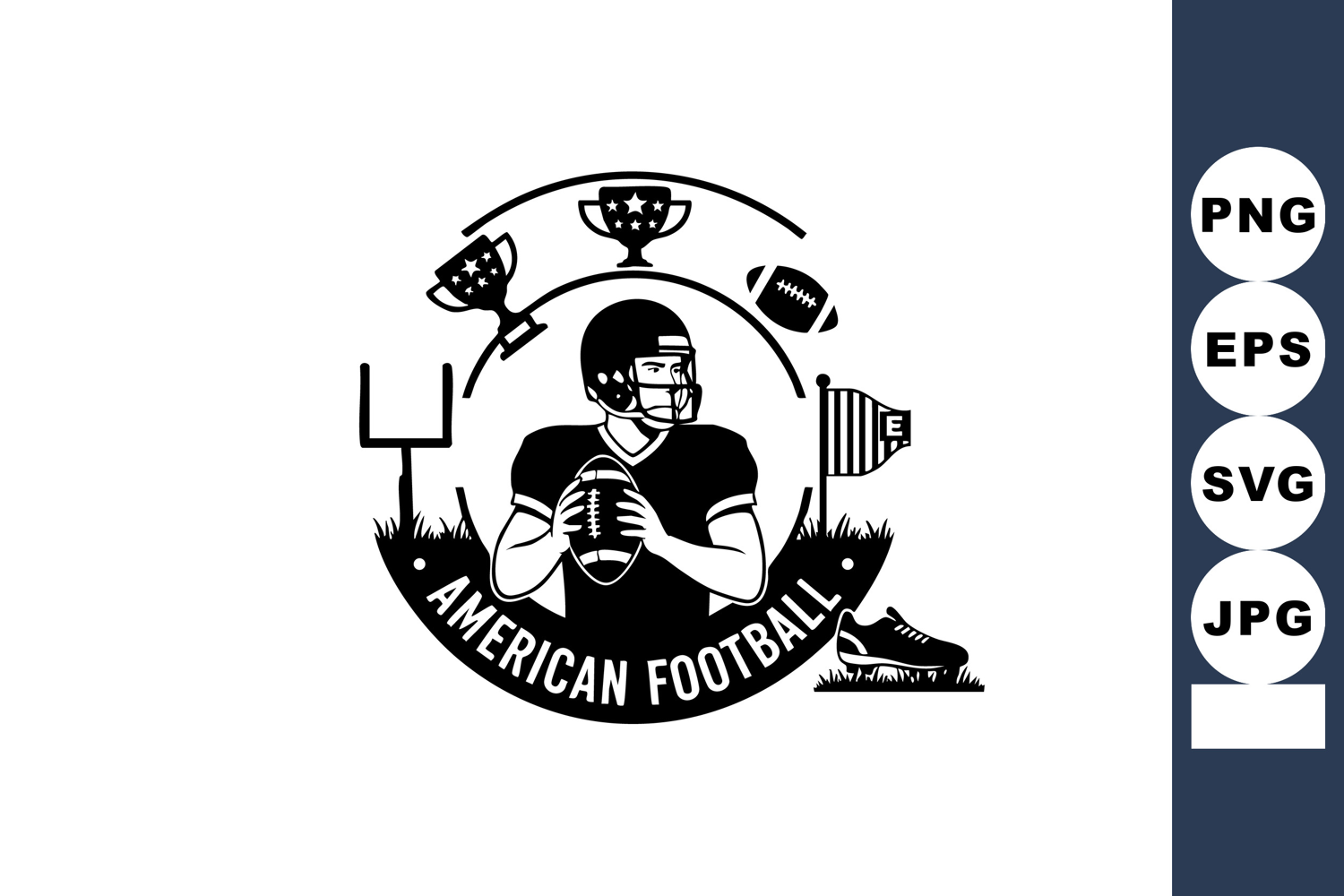 This vector image shows an American football player holding a ball, surrounded by a helmet, goal post, trophy cups, and cleats in a bold black and white style. Energetic mood.