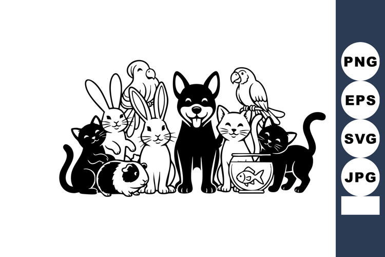 This black and white vector features a diverse group of pets such as cats, rabbits, a dog, a parrot, and a guinea pig arranged together, creating a friendly and charming scene. Cheerful mood.